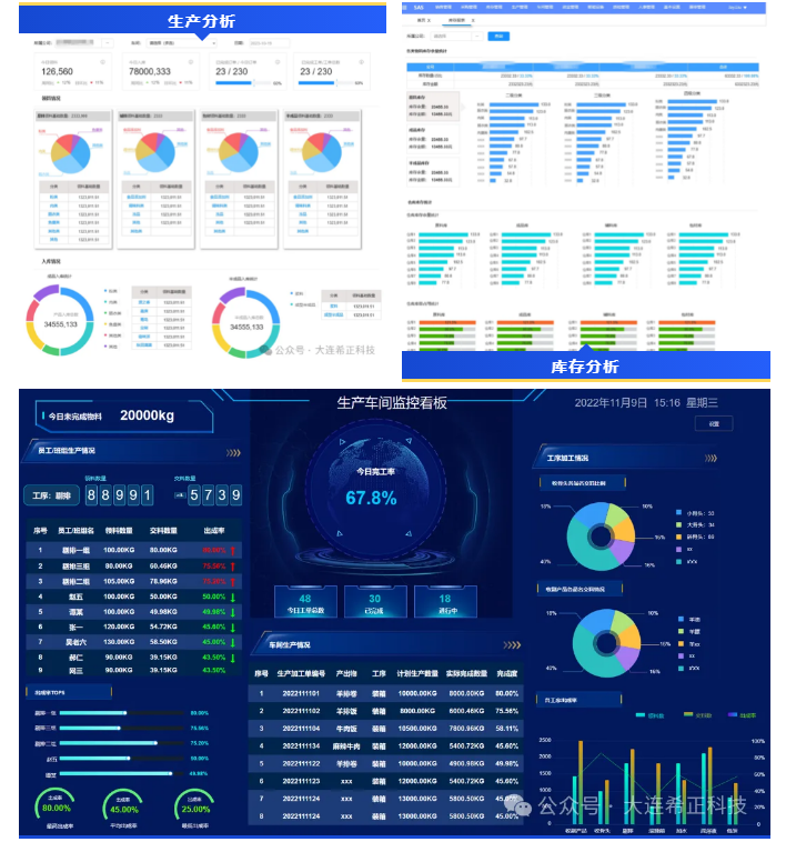 5、生产驾驶舱:实时展示车间订单数据、完成进度、原料投入量、关键工序出成率、裸品产出量、包装数量、入库数量、发货数量进度、本日出勤人数、水电气能耗情况。