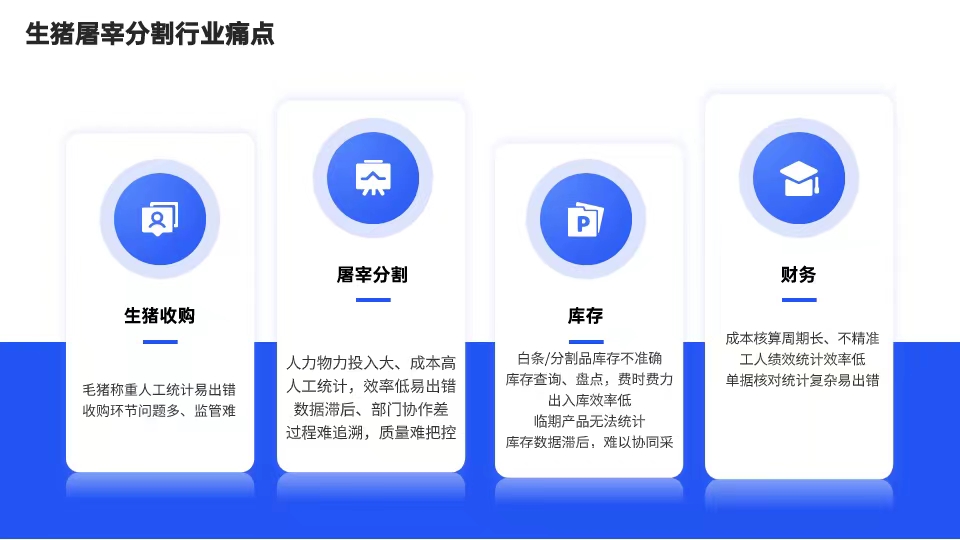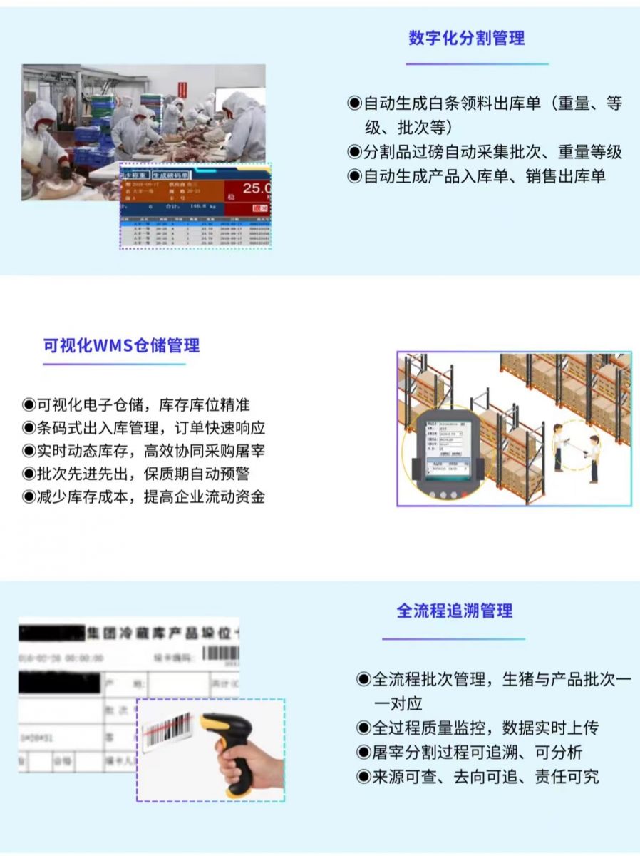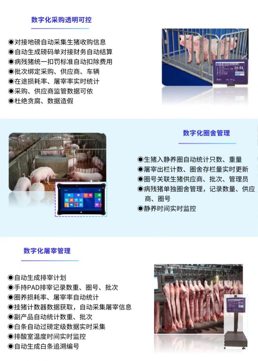 通过云存储、物联网、工业互联网等技术,对生猪采购、屠宰分割、仓储配送所有环节进行信息化升级,实现采购结算透明化、屠宰分割最优化、生产排产智能化、车间管理数字化、仓储管理可视化、业务财务一体化等管理目标。